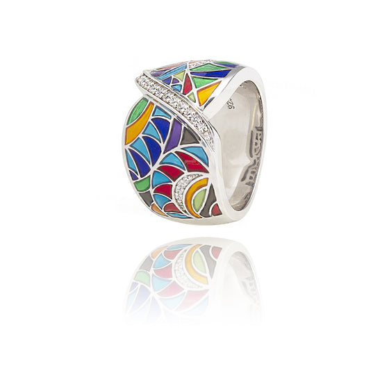 By putting on this rhodium plated silver and zirconium oxide ring from the new Una Storia jewellery, you are sure to find the perfect accessory infused with light to go with a trendy outfit. Whether you put on a long bohemian dress in Indian cotton or a safari and khaki pants set, this hand-lacquered sterling silver jewel is the assurance of visual success in every detail. This original women's ring, from the new 925 rhodium plated silver trendy jewellery collection Riviera 2023 Una Storia, widens on the top. The rhodium plated sterling silver and zirconium oxide ring is decorated with azure blue foliage, a colour reminiscent of the Mediterranean Sea, a stylized sun in summer tones and certain graphic elements with a geometric design symbolizing sand and local vegetation. The center of the jewel is encrusted with zirconium oxide stones that retain daylight to better concentrate and diffuse it around you. The riviera silver ring fits in with other 925 Una Storia silver jewellery while being a unique model of rare beauty. The rhodium plated sterling silver and zirconium oxide ring that you can find in the large sterling silver ring for women category can be a gift for a woman dear to your heart like your mother, your best friend or your sister. Think of this woman you cherish so much, the day she finds this little package under the tree, or on her plate on Mother's Day or on her birthday. What birthday gift for a 50-year-old woman ? These trendy silver jewels always give extreme pleasure to the one who receives them.