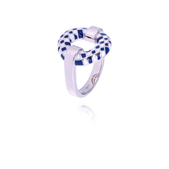 This round Damier Bari silver women's ring is part of the new Bari silver jewellery set collection. Find all the charm and grace of the "Dolce Vita", the aesthetics and culture of Italy where our family regularly stays. Una Storia is a family story that fell in love with Italy, its craftsmanship, its exceptional landscapes. This round ring in hand-lacquered rhodium plated silver is a very elegant piece of jewellery for women inspired by our stays in Italy. This round silver women's ring is composed of a ring inlaid with geometric figures in blue and white lacquer. Order the round Damier Bari silver women's ring from the Una Storia jewellery, all in sterling silver, some of which are inlaid with zirconium oxide stones. You can match this beautiful rhodium plated sterling silver ring with other jewellery from the same collection such as the Damier Bari silver bracelet or the Damier Bari dangling earrings.