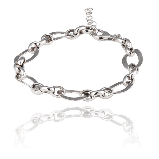 The Grenade silver circle bracelet for women is designed by our artisan jewellers in rhodium-plated sterling silver that does not oxidize. Made up of rounded and stretched chains with shapes to highlight a wrist and delicate hand, this large mesh silver bracelet highlights the elegant and refined woman thanks to its refined design shapes. This piece of jewellery in sterling 925 silver has been made with meticulous work and bears the name of the symbol of Andalusia, the southernmost region of Spain. The woman who wears it on her wrist can match this incomparably rendered silver bracelet with a fairly low-cut red dress belted at the waist to highlight her slim and slender figure, as well as pumps and a clutch in the same tone when she must go to a formal evening or a social cocktail party.