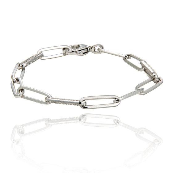The Una Storia® women's large link bracelet is part of the new Maillon set collection. It melts into your wrist like a kind of precious chameleon, so discreet is it. In rhodium-plated sterling silver, this women's bracelet is made up of rectangular links chained to each other to remain flexible and bring you ease and comfort. Its retro appearance gives it a natural chic air and allows this timeless accessory to slip on your wrist whatever the situation in which you find yourself. Forget it with jeans and a sweatshirt and show it off by wearing a lovely suit with a short, fitted skirt.