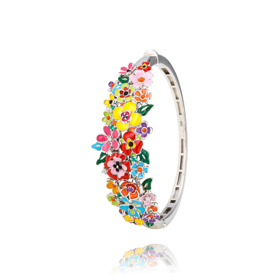 The large flower bangle is a centerpiece of the Una Storia women's silver bracelet collection, embodying the vibrant and colourful spirit of the island of Madeira. This floral-inspired bracelet, crafted in 925 silver, is a reflection of exceptional jewellery expertise and is a handcrafted creation imagined in our studio. Every detail of the silver flower jewellery is meticulously sculpted and adorned with enamel floral motifs. This jewel perfectly hugs the curve of your wrist, providing optimal comfort throughout the day. Thanks to its discreet safety catch, the large flower bangle stays securely in place, allowing you to wear it with complete peace of mind. Trendy and bold, it embodies the current fashion for voluminous and colourful jewellery. The vibrant shades of pink, blue, yellow and orange are reminiscent of the island's lush gardens and bring a touch of freshness and vitality to your wrist. For perfect harmony of your hands, pair it with the magnificent flower-shaped ring from the same collection. The large flower bangle can be worn with a plain dress or navy blue or red pants, and adapts to all your desires, enhancing each of your movements with grace.