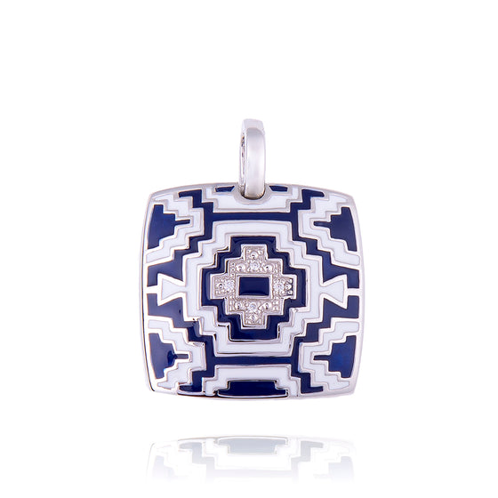 The Mexican pendant from our Una Storia French Design House draws the eye with its geometric shapes. An invitation to travel through Central America. With its square, slightly curved shape, its graphic print in obsidian blue, is reminiscent of Central American cultures, the Aztecs in particular. Wear this stunning square-shaped medallion pendant with a rhodium-plated silver chain, a navy blue waxed cotton cord or a silver chain sold separately on our official website. With this set, you will have a superb necklace that can be worn with several different outfits. A navy blue suit, a long white low-cut dress, a blue or white top with slim shoulder straps.