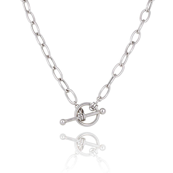 The Firenze silver T-clasp necklace for women draws its inspiration from the intricately detailed artworks of the Italian Renaissance. This delicate design evokes the grace of masterpieces created by masters such as Botticelli and Michelangelo. The silver tones, embellished with sparkling zirconium oxides inlays, add a touch of brilliance. This fashionable silver necklace is ideal for those who appreciate subtlety and understated elegance. The silver T-clasp necklace beautifully accentuates the neckline, adding a touch of sophistication to any outfit. If you prefer chunkier chains, also check out our other silver T-clasp necklace. One of the distinctive features of this sterling silver necklace is its stylish and practical T-clasp. This clasp can be worn at the front to add a modern touch to your look, or at the back for a more traditional and refined appearance. The adjustable length of the necklace allows you to wear it as a choker for a sophisticated look or slightly longer for a more relaxed style. The clasp of this women's silver sautoir necklace with a T-shaped clasp consists of a bar and a ring, distinguished by their simplicity. It offers a secure closure while adding a unique decorative element. Discover all our sterling silver torque necklaces .